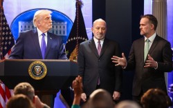 지난 20일(현지시간) 도널드 트럼프 미국 대통령이 워싱턴 DC 백악관 브리핑룸에서 연방 대법원의 상호관세 위법 판결에 대한 기자회견 도중 제이미슨 그리어 미국무역대표부(USTR) 대표의 발언을 듣고 있다. 가운데는 하워드 러트닉 상무장관. 로이터=연합뉴스 …