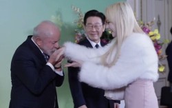 지난 23일 청와대 영빈관에서 열린 한·브라질 국빈 만찬에서 루이스 이나시우 룰라 다시우바 브라질 대통령(왼쪽)이 블랙스완 멤버 가비(오른쪽)의 손등에 입을 맞추고 있다. 사진 룰라 대통령 인스타그램 캡처 한국과 브라질 정상의 국빈 만찬에 K팝 걸그룹 멤…