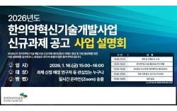 한의약혁신기술개발사업 신규과제 공고 사업 설명회 안내 포스터 한국한의약진흥원(원장 직무대행 송수진)이 27억 6,900만원 규모의 ‘2026년 제1차 한의약혁신기술개발사업 신규지원 대상과제’를 공모한다. 한의약혁신기술개발사업은 보건복지부가 추진하는 …