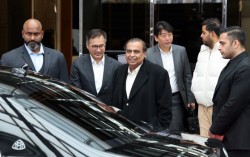 25일 서울김포비즈니스항공센터를 통해 입국한 '아시아 최대 부호' 무케시 암바니 인도 릴라이언스 그룹 회장(왼쪽 셋째)을 김우준 삼성전자 네트워크사업부장(왼쪽 둘째)이 안내하고 있다. 뒷줄 하얀색 점퍼 차림은 암바니 회장의 장남인 아카시 암바니 릴라이언스 지오 인포컴 …