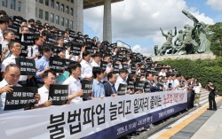 지난 8월 서울 여의도 국회 본청 앞 계단에서 열린 노동조합법 개정안 수정 촉구 경제계 결의대회에서 참석자들이 손팻말을 들고 있다. 연합뉴스 하청노조가 원청 사업주와 직접 교섭할 수 있도록 하는 노란봉투법(노란봉투법 2·3조 개정안) 시행령 일부개정안이 …