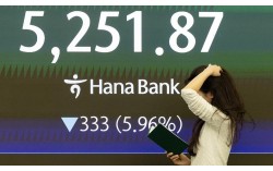 이란 사태로 국제유가가 폭등한 가운데 코스피가 6% 급락하며 5,200대로 마감한 9일 서울 중구 하나은행 본점 딜링룸에 코스피와 원/달러 환율이 표시돼 있다. 코스피는 전장 대비 333.00포인트(5.96%) 내린 5,251.87에, 코스닥은 52.39포인트(4.54…