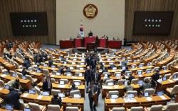 25일 국회에서 열린 2월 임시국회 본회의에 '법왜곡죄'를 포함한 형법 일부개정법률안(대안)이 상정된 뒤 국민의힘 조배숙 의원이 무제한 토론을 시작하자 더불어민주당 의원들이 본회의장을 떠나고 있다. 연합뉴스 162석 거대 여당인 더불어민주당이 25일 상법…