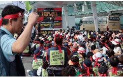 지난달 2일 인천국제공항 제1여객터미널에서 열린 민주노총 공공운수노조 인천공항지역지부 전면파업 2일차 총파업 결의대회에서 참석자들이 구호를 외치고 있다. 연합뉴스 24일 ‘노란봉투법’(개정 노동조합 및 노동관계조정법) 시행령에 담긴 교섭단위 분리제도가 ‘…