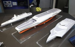 HD현대중공업이 마덱스 2025에서 선보인 미래 함정들. 제일 왼쪽에 있는 미래형 전투함이 안두릴과 공동제작하는 ASV 시제함과 다소 비슷한 형상이다. 왼쪽 둘째부터는 미래형 무인전력모함, 기동형 무인전력모함. HD현대중공업 HD현대가 미국 방산테크 기업…