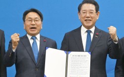 강기정(왼쪽) 광주시장과 김영록 전남도지사가 9일 오후 광주 서구 김대중컨벤션센터에서 열린 광주.전남 행정통합 시도민 보고회에 참석해 공동발표문을 들고 화이팅을 외치고 있다. 뉴시스 이재명 대통령이 광주시·전남도의 행정통합에 전폭적인 지원을 약속하면서 양…