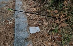 7일 자정쯤 청주 상당구 청소년광장에서 강아지와 함께 산책 중이던 50대 여성을 향해 날아든 화살이 땅바닥에 박혀 있는 모습. 연합뉴스 지난 7일 강아지와 산책하던 50대 여성 주변으로 화살을 쏜 20대 남성들이 불구속 입건됐다. 9일 청주 청원경찰서는 특수…