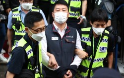 2021년 9월 2일 양경수 민주노총 위원장이 경찰에 연행되고 있다. 양 위원장은 그해 5~7월 서울 도심에서 코로나19 방역 지침을 어기고 불법 시위를 주도한 혐의를 받았다. 연합뉴스 코로나19 확산 시기 방역지침을 어기고 집회를 주도한 혐의로 재판에 넘겨진 양…