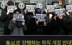 9일 서울 동덕여자대학교 월곡캠퍼스 본관 앞에서 열린 ‘학칙 개정 관련 설문조사 결과 발표 기자회견’에서 동덕여대 총학생회 등 참석자들이 통보로 강행하는 학칙 개정을 반대하는 내용의 손 피켓을 들고 있다. 연합뉴스 동덕여대 대학평의원회가 공학 전환과 학칙 개정 심…
