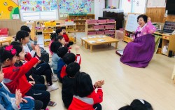 한국국학진흥원 '이야기할머니'로 활동하고 있는 배금옥씨가 경북 구미 지역 한 유아교육기관에서 어린이들에게 이야기를 들려주고 있다. 사진 배금옥 8일 오전 경북 구미시 사곡동 적십자재난구호센터. 이른 아침부터 노란색 적십자봉사단 조끼를 입은 이들 수십 명이…