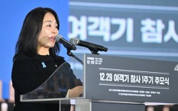 김유진 유가족협의회 대표가 12·29 제주항공 여객기 참사 1주기인 지난달 29일 오전 전남 무안국제공항에서 열린 추모식에 참석해 추모사를 하고 있다. 사진공동취재단 12·29 제주항공 여객기 참사 유가족협의회는 8일 "무안공항에서 발생한 참사가 명백한 인재라고 …