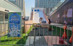 경기도가 도청사 앞 광장인 도담뜰에 만들어지는 눈썰매장의 모습. 관련 예산으로 5억원이 투입됐다. 최모란 기자 경기도가 도청 앞 광장에 만드는 ‘겨울 눈밭 놀이터’를 놓고 의견이 엇갈리고 있다. 지역 온라인 카페 등을 중심으론 “언제 개장하느냐”는 기대…