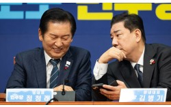 정청래 더불어민주당 대표와 김병기 당시 원내대표가 지난달 15일 서울 여의도 국회에서 열린 최고위원회의에서 대화하고 있다. 뉴스1 정청래 더불어민주당 대표가 김병기 전 원내대표의 공천 헌금 의혹을 묵인했다는 의혹으로 시민단체에 7일 고발당했다. 사법정의바로세…