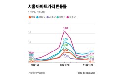 10·15 부동산 대책 발표 후 서울 아파트 매매가격 상승세가 3주 연이어 잦아들었다. 하지만 둔화 폭은 줄고 있다. 집값 상승 기대감이 여전하기 때문으로 풀이된다. 서초·송파·용산·성동구는 집값 상승 폭이 전주보다 오히려 커졌다. 13일 한국부동산원의 ‘11월 …