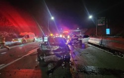4일 오전 1시 23분께 전북 고창군 서해안고속도로 상행선 고창 나들목 인근에서 발생한 잇따른 교통사고로 사고 차량이 크게 파손돼 있다. 연합뉴스 서해안고속도로에서 교통사고 수습 현장을 덮쳐 경찰관과 견인차 기사 등 2명이 숨지고 9명이 다친 사고를 낸 30대 운…