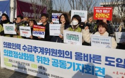 경실련, 보건의료산업노조, 한국노총, 한국환자단체연합회로 결정된 국민중심 의료개혁 연대회의 관계자들이 지난해 2월 14일 서울 여의도 국회 앞에서 기자회견을 열고 의료인력 수급추계위원회 도입과 관련해 의료 공급자·수요자·전문가 동수 참여, 추계위 의결권 배제, 2026…