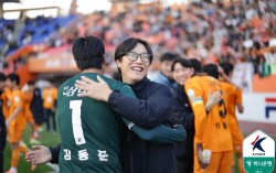 올 시즌 제주를 강등 위기에서 구한 김정수 감독대행은 사령탑 공석인 제주와 광주의 차기 감독 후보로 주목 받는다. 제주의 K리그1 잔류가 확정된 직후 선수들과 기쁨을 나누는 김정수 대행. 사진 한국프로축구연맹 올해 프로축구 …
