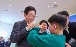 이재명 대통령이 지난해 12월 24일 서울 서대문구 신촌세브란스 연세암병원 중입자치료센터에서 열린 희귀질환 환우·가족 간담회를 마친 후 어린이에게 손하트를 그려보이고 있다. 사진 대통령실 고액 의료비가 드는 희귀·중증난치 질환에 대한 건강보험 본인 부담률…