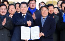 지난 2일 오전 광주 북구 운정동 국립 5·18 민주묘지에서 강기정 광주시장·김영록 전남지사가 광주·전남 행정통합 선언문을 발표한 뒤 기념사진을 찍고 있다. 연합뉴스 광주광역시와 전남도가 6·3 지방선거 때 통합 단체장을 선출하겠다고 전격 선언한 후 광주…
