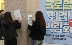 10일 부산시청 대회의실과 대강당에서 열린 '2025 부산청년 글로벌 취업박람회'를 찾은 청년구직자들이 벽에 기대어 설문지를 작성하고 있다. 연합뉴스 제조업 중심으로 고용 한파가 이어지면서 지난달 구직자 한 명당 일자리가 0.42개에 그쳤다. 이는 10월…