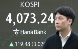 10일 오후 서울 중구 하나은행 본점 딜링룸 현황판에 코스피 지수가 표시돼 있다. 이날 코스피는 전 거래일보다 119.48포인트(3.02%) 오른 4073.24로 마감했다. 연합뉴스 코스피가 3% 이상 급등하며 하루 만에 4000선을 탈환했다. 배당소…