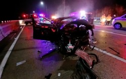 4일 오전 1시23분쯤 전북 고창군 서해안고속도로 상행선 고창 나들목 인근에서 발생한 잇따른 교통사고로 사고 차량이 크게 파손돼 있다. 전북특별자치도 소방본부=연합뉴스 고속도로에서 교통사고를 처리하기 위해 도로에 있던 경찰관과 견인차 운전자 등이 차량에 …