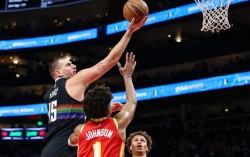 덴버 너기츠의 센터 니콜라 요키치가 5일 애틀랜타 호크스와 경기에서 골밑슛을 하고 있다. 두 명의 수비수가 가로막았지만 가드처럼 날렵한 2m11㎝의 거구 요키치를 막기엔 역부족이다. 요키치는 정규리그 MVP를 3차례 수상했다. [AP=연합뉴스] 덴버 너기…
