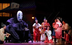 음악극 ‘센과 치히로의 행방불명’에서 ‘가오나시’(왼쪽)와 ‘치히로’가 마주한 장면. 10여 명의 배우가 검은 천을 뒤집어쓴 채 한 몸이 돼 거대해진 가오나시를 연기한다. [사진 토호] 실사판으로 나온 ‘치히로’는 여전히 사랑스러웠다. 원작 애니메이션 속…