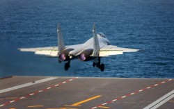 중국이 제작한 젠-15T 전투기가 중국 3호 항모인 푸젠함에서 전자식 사출기를 이용해 이륙하고 있다. 중국 관영매체는 23일 취역을 앞둔 푸젠함에서 젠-35, 젠-15T, 쿵징-600 기종이 전자기 사출기를 이용한 이·착함 시험을 완수했다고 훈련 영상을 공개했다. 신화…