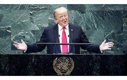 “2년도 지나지 않은 시점에서 내 행정부는 미국 역사를 통틀어 가장 많은 성취를 이뤄냈다.” 도널드 트럼프 대통령이 2018년 9월 25일 유엔총회 연설 중 세계 지도자들의 조롱 섞인 비웃음이 터져나오자 "이런 반응은 예상하지 못했다"며 상황을 수습하고 있다. 연합…