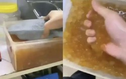 중국의 한 밀크티 가게 직원이 SNS에 올린 영상이 논란이 됐다. 사진 바이두 캡처 중국의 한 밀크티 가게 직원이 밀크티 토핑이 담긴 용기에 슬리퍼를 넣고 맨손으로 주무르는 등 비위생적인 행동을 하는 영상을 공개했다가 경찰에 붙잡혔다. 19일 광명일보 등에 …