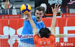 도로공사 모마가 IBK기업은행 블로킹 벽 위로 스파이크하고 있다. 모마는 두 팀 합쳐 최다인 33득점했다. [사진 KOVO] 4연승 파죽지세의 두 팀 간 대결답게 매우 치열했다. 풀세트 접전 끝에 웃은 쪽은 선두 한국도로공사였다. 김종민 도로공사 감독은 개인 통산…