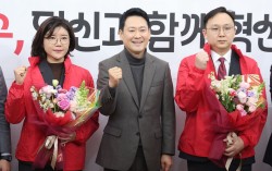 장동혁 국민의힘 대표가 25일 서울 여의도 국회에서 열린 지역발전 인재 영입 환영식에서 손정화 삼일 PWC 회계법인 파트너(왼쪽)와 정진우 현대엔지니어링 에너지영업팀 매니저와 함께 기념 촬영을 하고 있다. 뉴스1 국민의힘이 6·3 지방선거를 앞두고 25일…