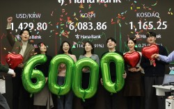 코스피가 사상 처음으로 6000을 돌파해 거래를 마친 26일 서울 중구 하나은행 딜링룸에서 딜러들이 기념 세리머니를 하고 있다. 연합뉴스 코스피 지수가 25일 사상 처음으로 6000 이상으로 마감됐다. 코스피는 이날 1.91% 오른 6083.86에 거래를 마…