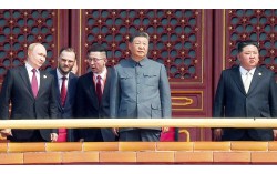 3일 중국의 전승 80주년을 기념하는 열병식 참관을 위해 26개국 정상들이 베이징의 천안문 망루로 이동하고 있다. 맨 앞줄에서 블라디미르 푸틴 러시아 대통령(왼쪽부터), 시진핑 중국 국가주석, 김정은 북한 국무위원장이 나란히 걸어가고 있다. 3국 정상이 한자리에 모인 …