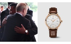 지난 3일 방중 당시 김정은 북한 국무위원장이 블라디미르 푸틴 러시아 대통령과 포옹하던 모습. 당시 그가 착용한 손목시계는 18K 레드 골드 케이스의 IWC 샤프하우젠 포르토피노 오토매틱 손목시계(현재 공식홈페이지 기준 14100달러, 약 2000만원)로 추정된다. 사…