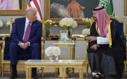 13일(현지시간) 사우디아라비아의 리야드 킹 칼리드 국제공항 청사. 이날 사우디를 방문한 도널드 트럼프 미국 대통령은 사우디 측으로부터 아랍 커피를 대접받았다. 사우디에선 극진한 환대의 의미로 손님에게 커피를 내오는 전통이 있다. 도널드 트럼프 미 대통령(왼쪽)이 13…