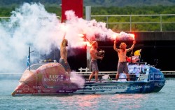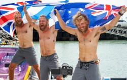스코틀랜드 출신 형제 라클란(왼쪽부터)·제이미·이안 맥클린이 지난 30일(현지시간) 호주 퀸즐랜드주 북부 케언스에 도착해 기쁨을 나누고 있다. AFP=연합뉴스 스코틀랜드 출신 맥클린 3형제가 140일간 쉬지 않고 노를 저어 태평양을 횡단하며 세계 최단 기록을 세웠…