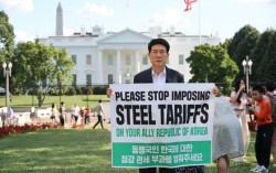 지난 1일 오후 3시(현지시각) 미국 워싱턴D.C. 백악관 앞에서 이강덕 경북 포항시장이 한국에 대한 고율 철강 관세 부과를 멈춰 달라는 내용의 피켓을 들고 시위를 벌이고 있다. 사진 포항시 지난 1일 오후 3시(현지시각) 미국 워싱턴 D.C. 백악관 앞…