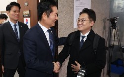 정청래 더불어민주당 대표가 24일 오전 서울 여의도 국회에서 김남준 전 청와대 대변인과 면담을 마치고 악수를 하고 있다. 뉴시스 김남준 전 청와대 대변인이 24일 여당 대표를 찾아 6·3 지방선거와 함께 치러지는 국회의원 재·보궐선거 때 인천 계양을에 출마하겠다는…