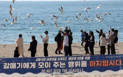 9일 부산 해운대를 찾은 해외 관광객들이 갈매기에게 모이를 주며 기념사진을 찍고 있다. 해운대구청은 갈매기의 야생성을 지켜주고 생태계 보호를 위해 모이 주는 것을 금지하고 있다.