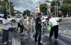29일 오전 10시 20분께 중구 대사동 충무로 네거리에서 주류 박스를 싣고 달리던 주류 운반 차량에서 맥주병 20상자가 도로위로 쏟아졌다. 대전시체육회 직원들이 쏟아진 맥주병을 치우고 있다. 사진 대전시체육회=뉴스1 대전 시내 도로에 쏟아져 깨진 400여개의 맥…
