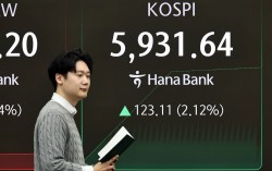 23일 서울 중구 하나은행 딜링룸 현황판에 코스피 지수 등이 표시되고 있다. 이날 코스피 지수는 전 거래일 대비 1.63%오른 5903.11에, 코스닥은 1.12% 오른 1166.94에 개장했다. 연합뉴스 코스피 지수가 23일 장중 사상 처음으로 5930선을 …