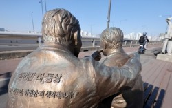 서울 마포대교에 설치된 '한번만 더, 동상' 모습. 뉴스1 “우리는 아직도 자살을 개인의 문제로 보는 시각이 많습니다. 이제는 개인이 아닌 ‘사회의 문제’로 보고 대처해야 합니다.” 26일 한국신문방송편집인협회가 주최한 ‘2025 생명존중 미디어포럼’에서 백…