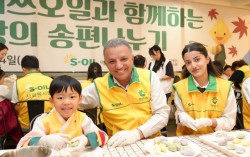 안와르 알 히즈아지(가운데) 에쓰오일 최고경영자(CEO)가 24일 서울 마포구 본사 사옥에서 열린 '사랑의 송편 나누기' 행사에서 송편을 빚고 있다. 사진 에쓰오일 에쓰오일이 24일 사랑의 전화 마포종합사회복지원과 함께 서울 마포구 본사 사옥에서 추석 맞…