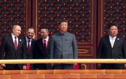 3일 중국 천안문 망루에 '북ㆍ중ㆍ러' 3국 정상이 나란히 섰다. 왼쪽부터 블라디미르 푸틴 러시아 대통령, 시진핑 중국 국가주석, 김정은 북한 국무위원장. 평양 노동신문=뉴스1 지난 3일 열린 중국 전승절 기념식에 참석한 우원식 국회의장 등 한국 대표단을…