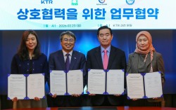 KTR 김현철 원장(왼쪽 두 번째)이 KMF 김동억 이사장(오른쪽 두 번째), KHA 김원숙 대표(오른쪽 첫 번째), IHCC 이선아 대표(왼쪽 첫 번째)와 상호 협력을 위한 업무협약을 체결했다. KTR(한국화학융합시험연구원, 원장 김현철)이 식품 화장…