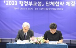 협약서에 서명하는 이철수 국가공무원노조위원장(오른쪽)과 최동석 처장. [사진 국가공무원노조] 인사혁신처가 국가공무원노동조합(국공노)과 ‘2023년 행정부 교섭’을 타결했다. 정부와 국공노는 21일 정부세종청사에서 단체협약을 체결했다. 이에 따라 지난 20…