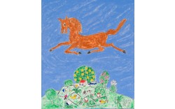 이왈종의 신작 ‘제주 생활의 중도(中道)’(53x45.5㎝). 새해의 설렘을 하늘을 나는 붉은 말에 담았다. [사진 왈종미술관] 파란 하늘을 달리는 붉은 말, 그 아래 양지바른 마을, 주렁주렁 매달린 노란 하귤, 붉은 동백, 오밀조밀 들어선 집들, 그 집…