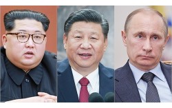 왼쪽부터 김정은 북한 국무위원장, 시진핑(習近平) 중국 국가주석, 블라디미르 푸틴 러시아 대통령. 중앙포토 김정은 북한 국무위원장의 다음 달 3일 중국 '항일전쟁 및 세계 반파시스트 전쟁 승전(전승절) 80주년 열병식' 참석을 두고 외신들은 28일 ‘김 …